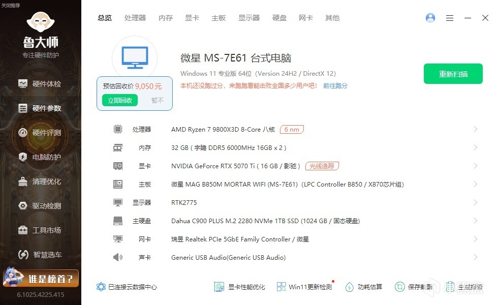 ▼整机配置一览,处理器是9800X3D,主板是微星的MAG B850M MORTAR WIFI迫击炮,显卡是影驰的RTX 5070 Ti金属大师黑金版OC。