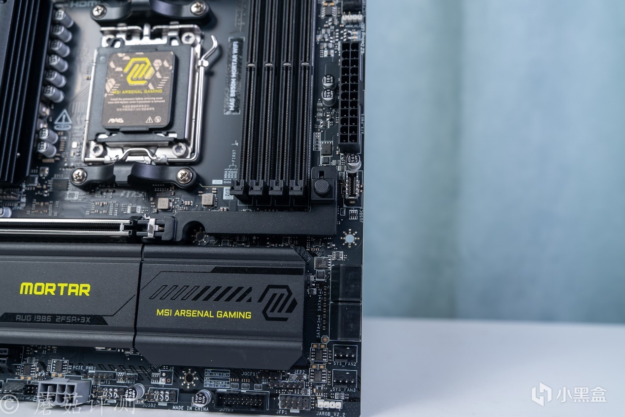 ▼微星B850M迫击炮主板正面的金属覆盖件并无灯效,但表面处理和涂装很精致,