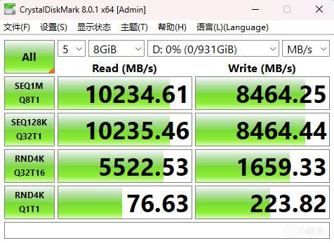 ▼简单跑个DiskMark,测试文件大小8GB,顺序读取速度10234MB/s、写入速度8464MB/s,这个数据表现特别的夸张。4K性能方面,读取速度76MB/s、写入速度223MB/s,也还不错。