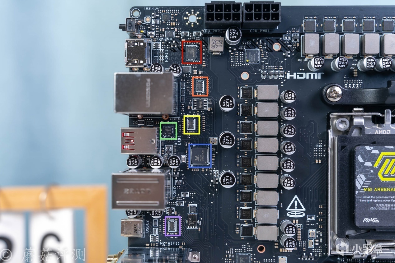 ▼主板后部IO接口的后面,各种芯片,红框芯片丝印RTD2151,HDMI主控芯片,给后面的HDMI视频输出接口提供支持;橙框和黄框芯片丝印P13EQX10,这是一颗多路复用器/解多路复用器转接驱动器,给主板后部的USB 3.2 Gen2 Type-A接口提供支持;绿框芯片丝印ASM1543,USB Type-C主控芯片,给旁边的Type-C接口提供支持;篮筐芯片丝印RTL8126,小螃蟹出品,给主板后部5Gbps的有线Lan口提供支持;紫框芯片丝印P13EQX2,给旁边的USB-C接口提供支持。