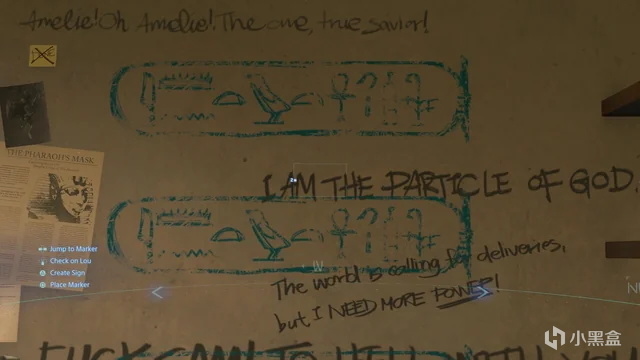 《死亡擱淺》中,Higgs的全名則是:Higgs Monaghan。從這個角度來看,Higgs也算得上是一位精神上的激進信徒。他從滅絕體Amelie那裏獲得了杜姆斯能力,並被她的力量與存在所深深吸引,最終開始崇拜她。Higgs成爲了滅絕體Amelie的延伸之手,成爲一個“力量承載者”、“信使粒子”,正如“希格斯玻色子”這個物理學概念所暗示的一樣(前文有聊到,不再贅述)。甚至在他房間的牆上寫着:“Amelie!Oh Amelie!唯一的、真正的救世主!”(圖中左上方),而且我們還能看到牆上印着一些古埃及象形文字(綠色圖案)。
