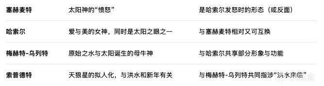 而與“遠行女神”神話有關的幾位女神:Sekhmet(塞赫麥特)、Hathor(哈索爾)、梅赫特-烏列特、索普德特,她們不是“同一個人”,但在某些神話傳統中,她們是彼此的化身、變體,或不同面向,正如《死亡擱淺》裏的Bridget、Amelie這些屬於一個角色的多重身份。