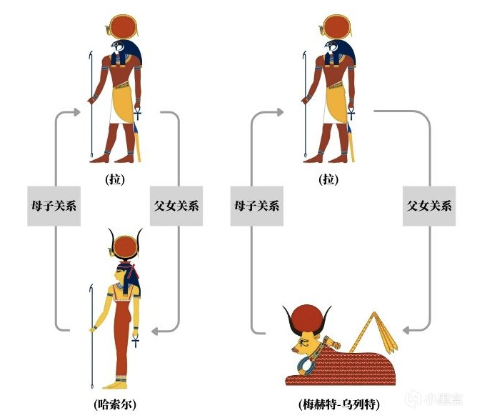有時,阿圖姆是從努恩中誕生的創世神,“Isis”(伊西斯,阿圖姆的孫女)等同於梅赫特-韋雷特;另一些時候,拉是創世神,“Hathor”(哈索爾,拉的女兒兼母親)等同於伊西斯;還有些時候,梅赫特-烏列特創造了萬物並生下了拉(梅赫特-烏列特的兒子兼父親)......這被稱爲“Cycle of Rebirth”(重生循環)。