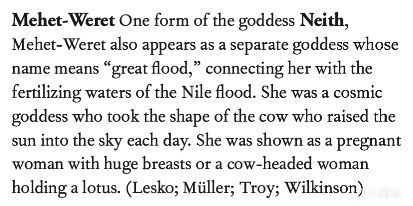 代表天狼星的星辰女神是Sopdet(索普德特),她和創世女神Mehet-Weret(梅赫特-烏列特)一樣,都與尼羅河洪水有關。在古埃及語中“Mehet-Weret”的字面意思就是“大洪水”,並且這兩位女神在神話中常被認爲是同一存在。