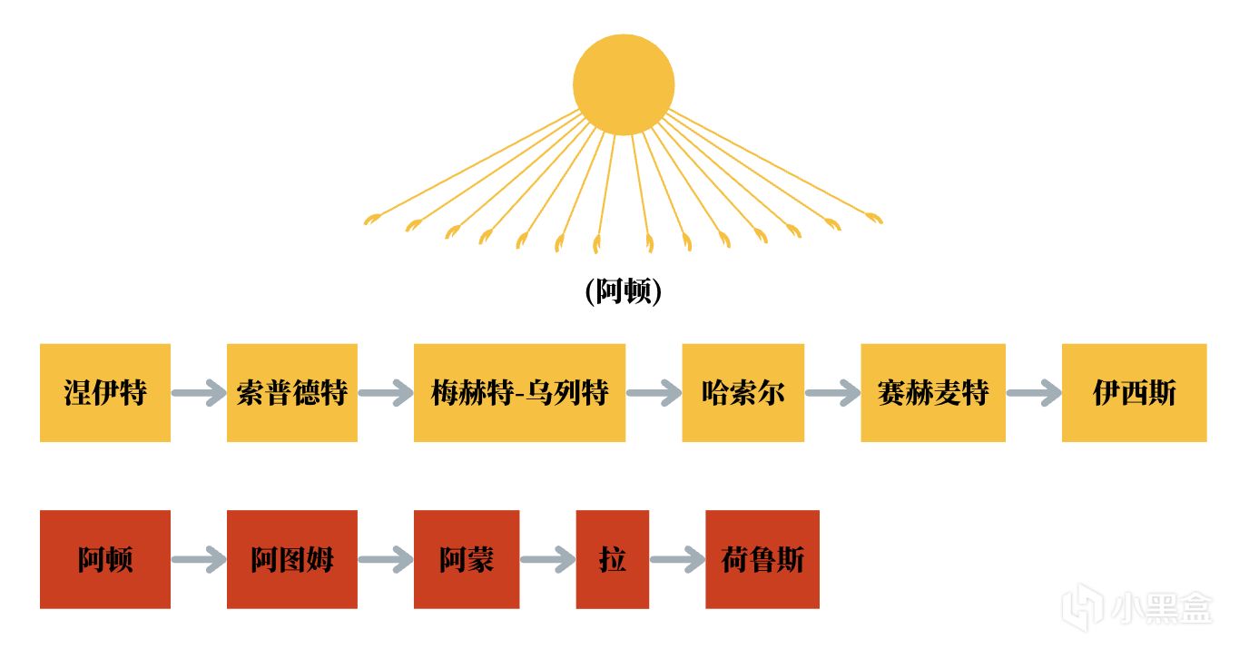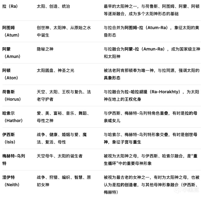 我知道“重生循環”繞來繞去讓人非常困惑,其實許多名字指的是同一位的神,比如:太陽是拉、阿圖姆、“Amun”(阿蒙)、“Aton”(阿頓)以及“Horus”(荷魯斯)的象徵,這些神在歷史的發展中逐漸融合,而他們都被視爲“太陽神”;索普德特或赫梅特-烏列特與“Neith”(涅伊特)、哈索爾和伊西斯合併,她們都被視爲“出生、生育和輪迴女神”。