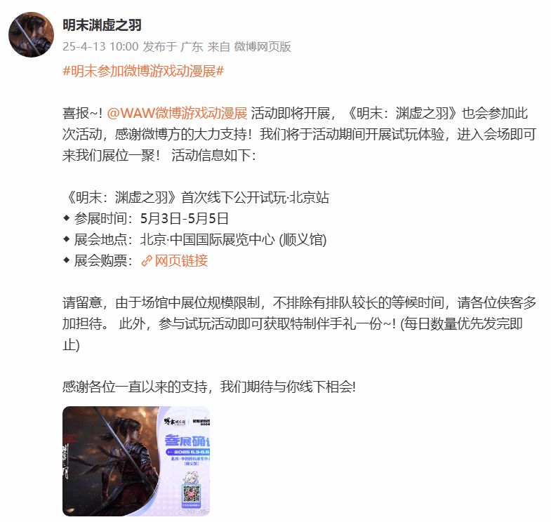 而在最近,《明末:淵虛之羽》終於有線下試玩了,官方發文宣佈參加WAW微博遊戲動漫展,計劃在活動期間開展首次線下試玩體驗。