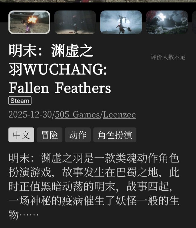 2025年4月18日《明末:淵虛之羽》在推特上公佈了一段新實機,時長23秒,展示了女主與怪物戰鬥的場面。