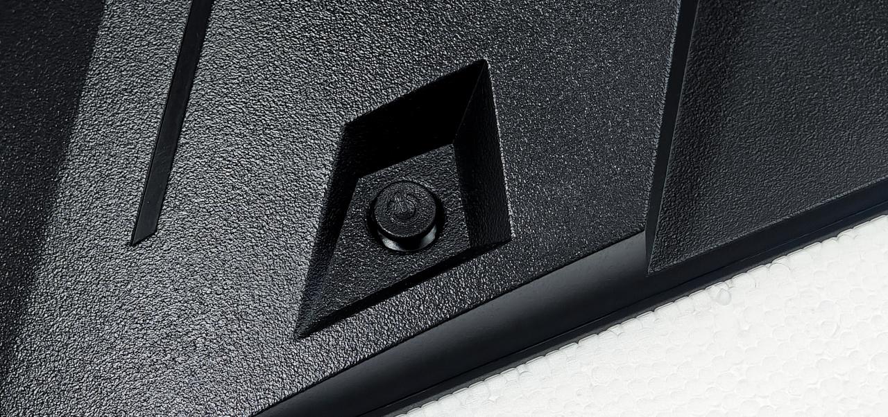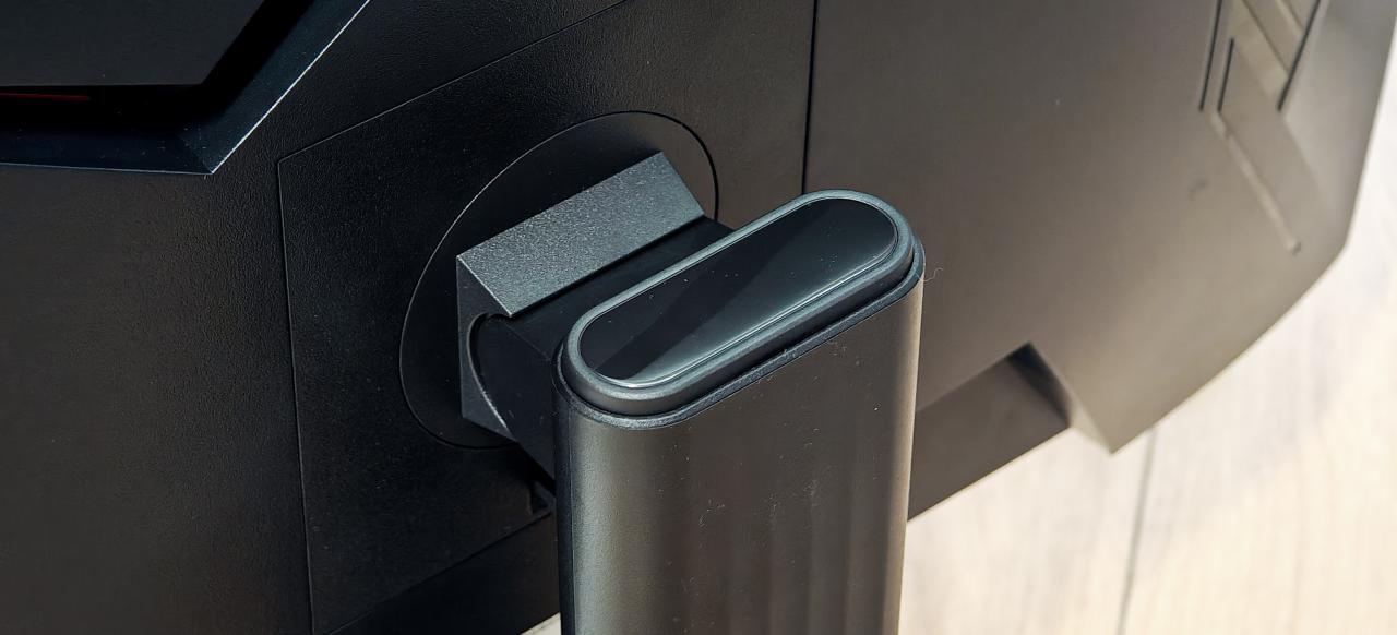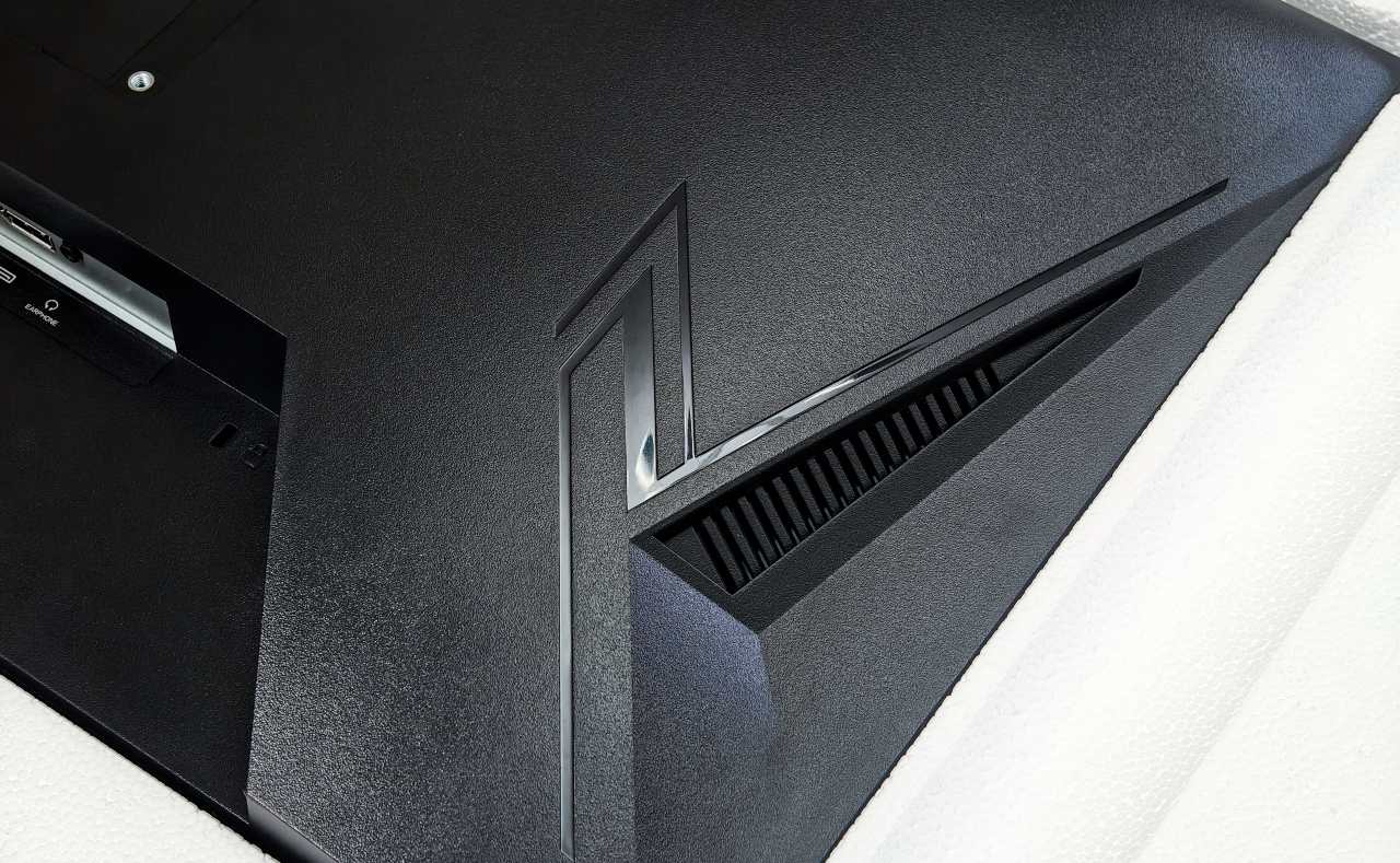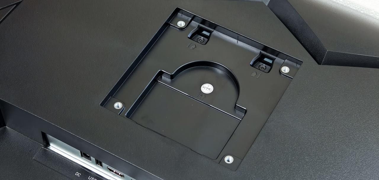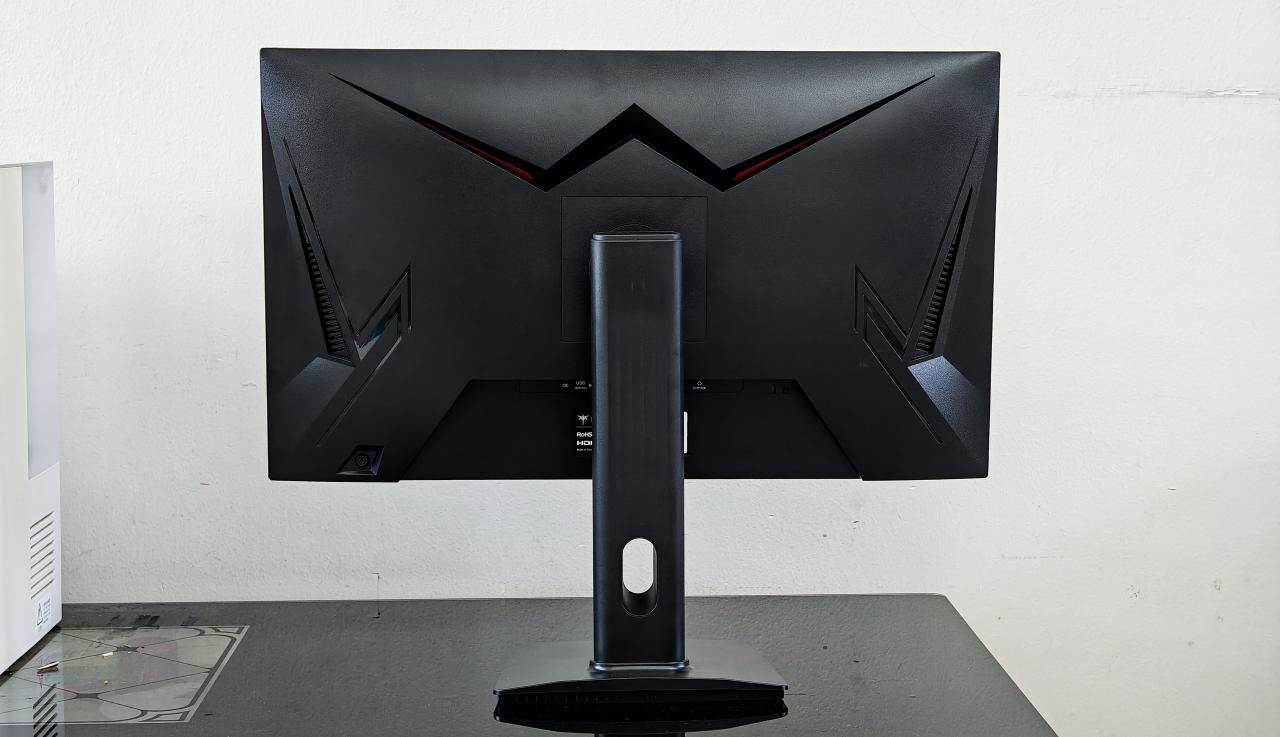 背面虽然没有灯效但是做 了电竞风格的撒热设计,看起来还是挺帅的,支架下面有做一个束线孔位,方便理线。