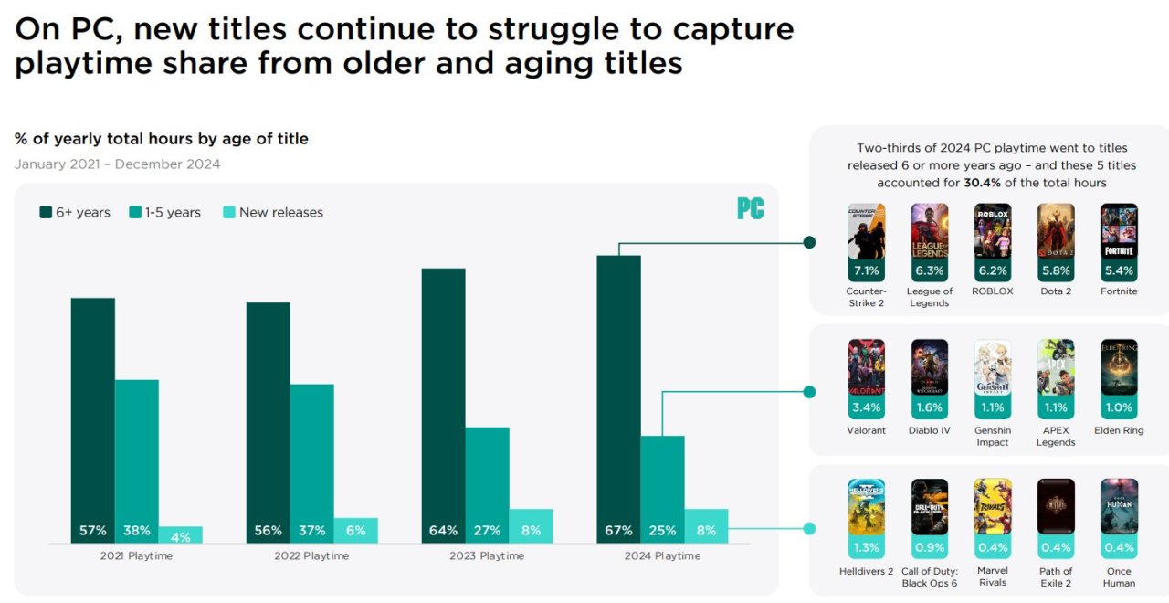 2024年玩家总游戏时长同比增长6%,其中PS5玩家群体增长21%,但PC和Xbox玩家数量稳定。