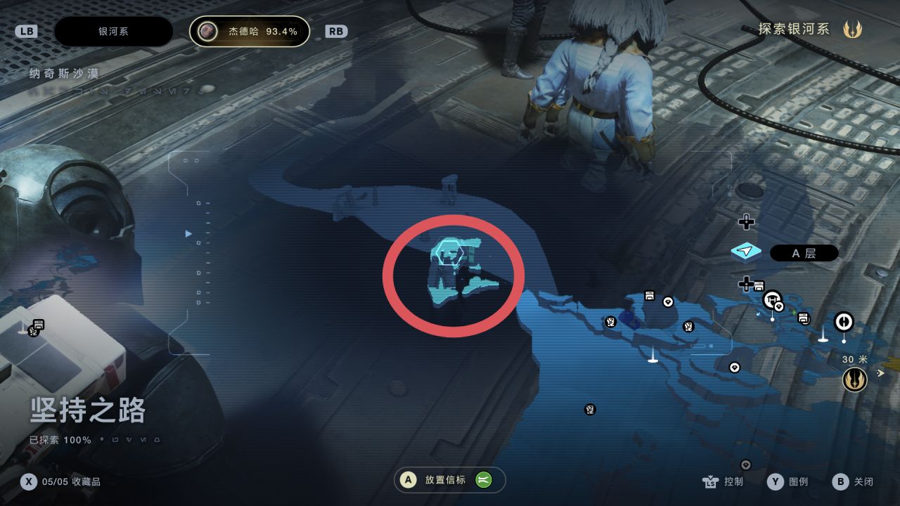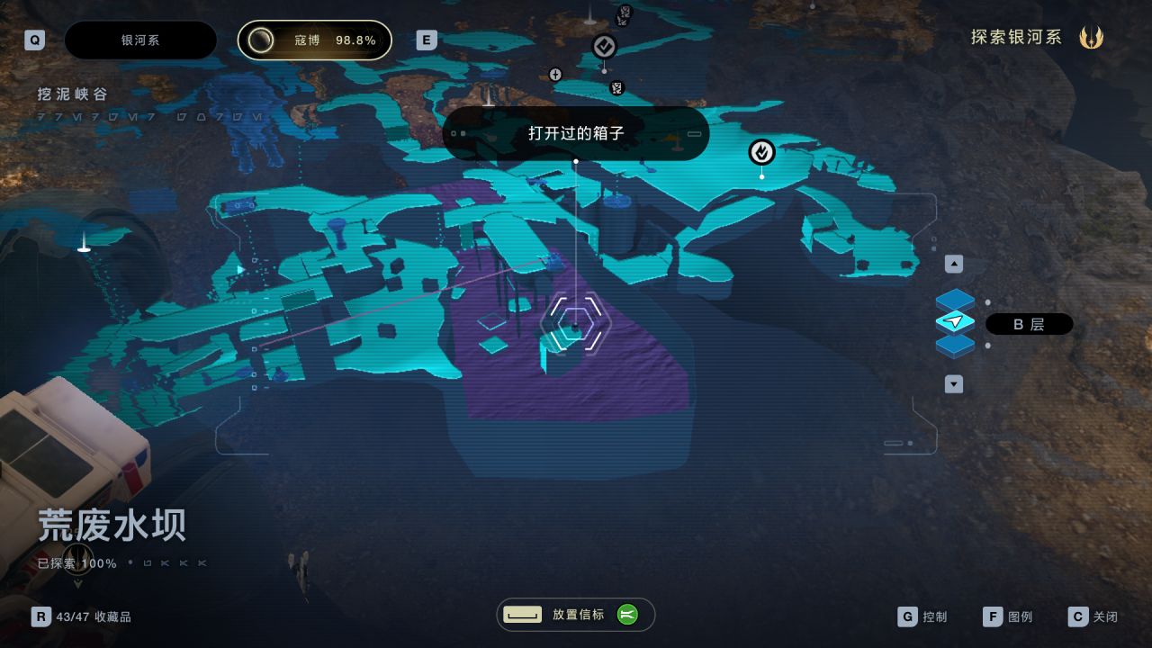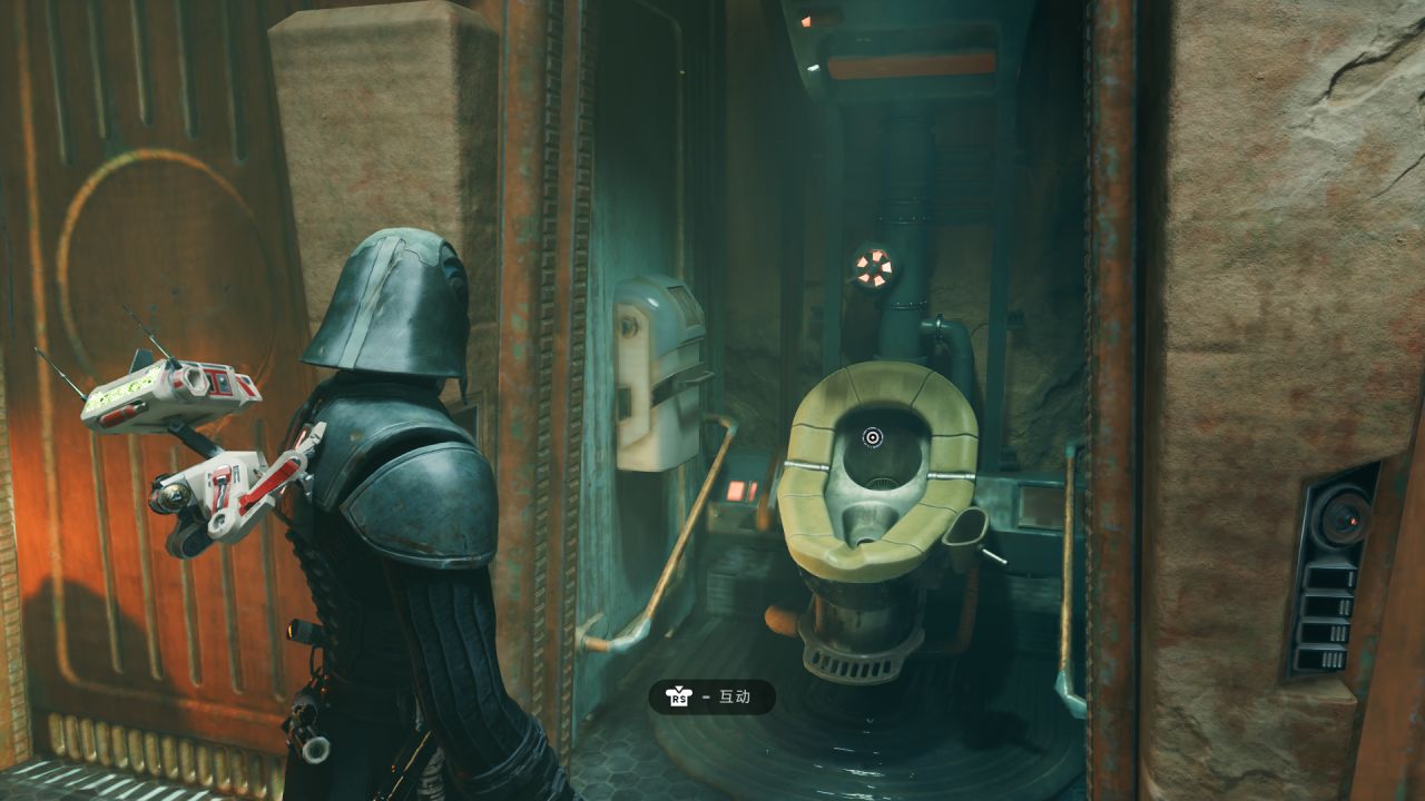 在荒废水坝往回走的焦油坑里,要先解锁原力抬升技能。帮完忙别忘了招募小机器人。