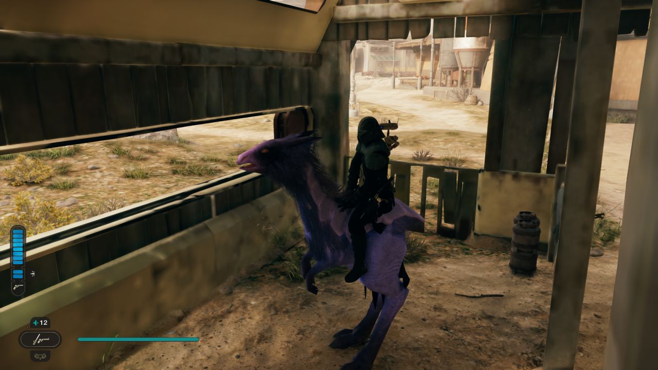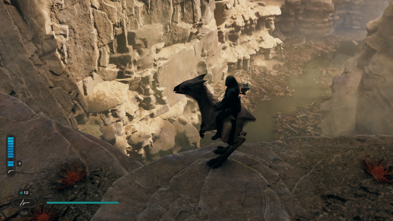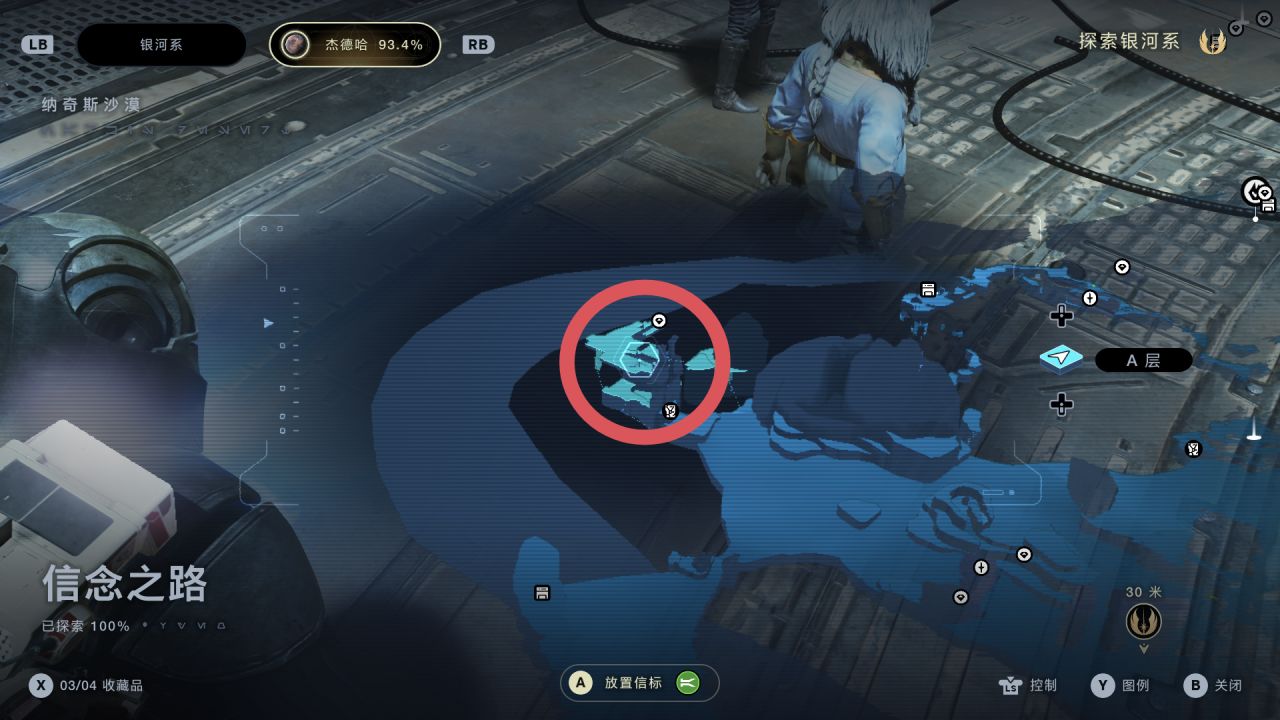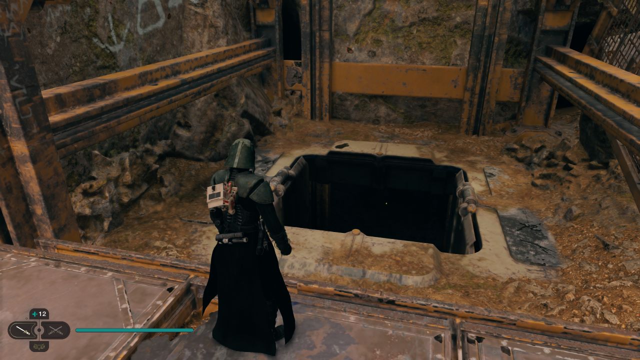 在荒废水坝往回走的焦油坑里,要先解锁原力抬升技能。帮完忙别忘了招募小机器人。