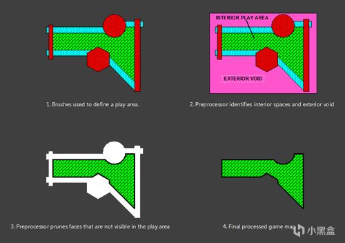 所有角色、场景和物体均由多边形构建,彻底告别了《德军总部3D》的伪3D光线投射技术。《雷神之锤》Quake引擎,简称Q1引擎,支持动态光影、粒子特效和动画骨骼系统,与毁灭战士引擎一样使用了BSP树二叉空间分割算法,通过递归分割空间优化渲染顺序,提升复杂场景的渲染效率。