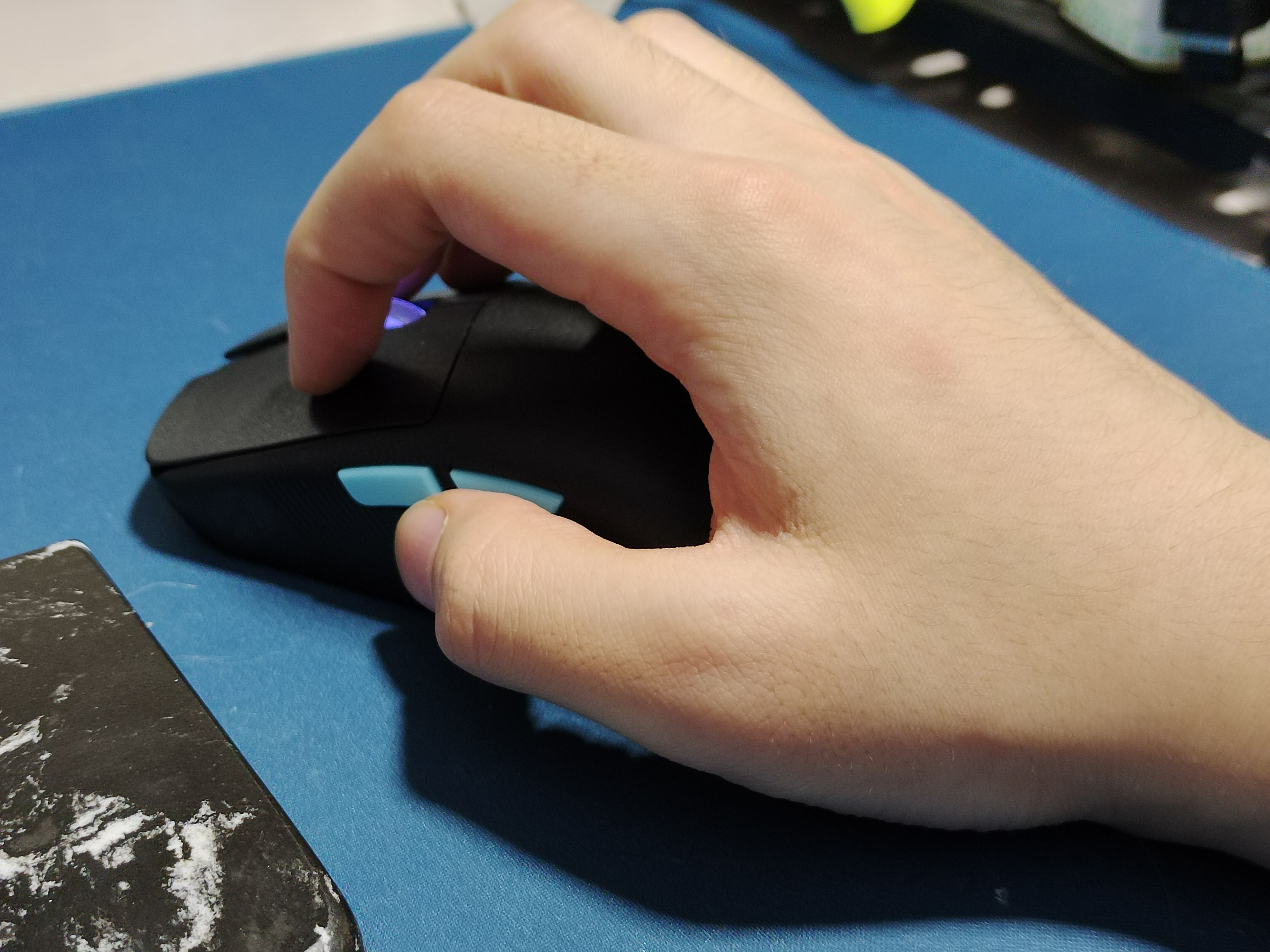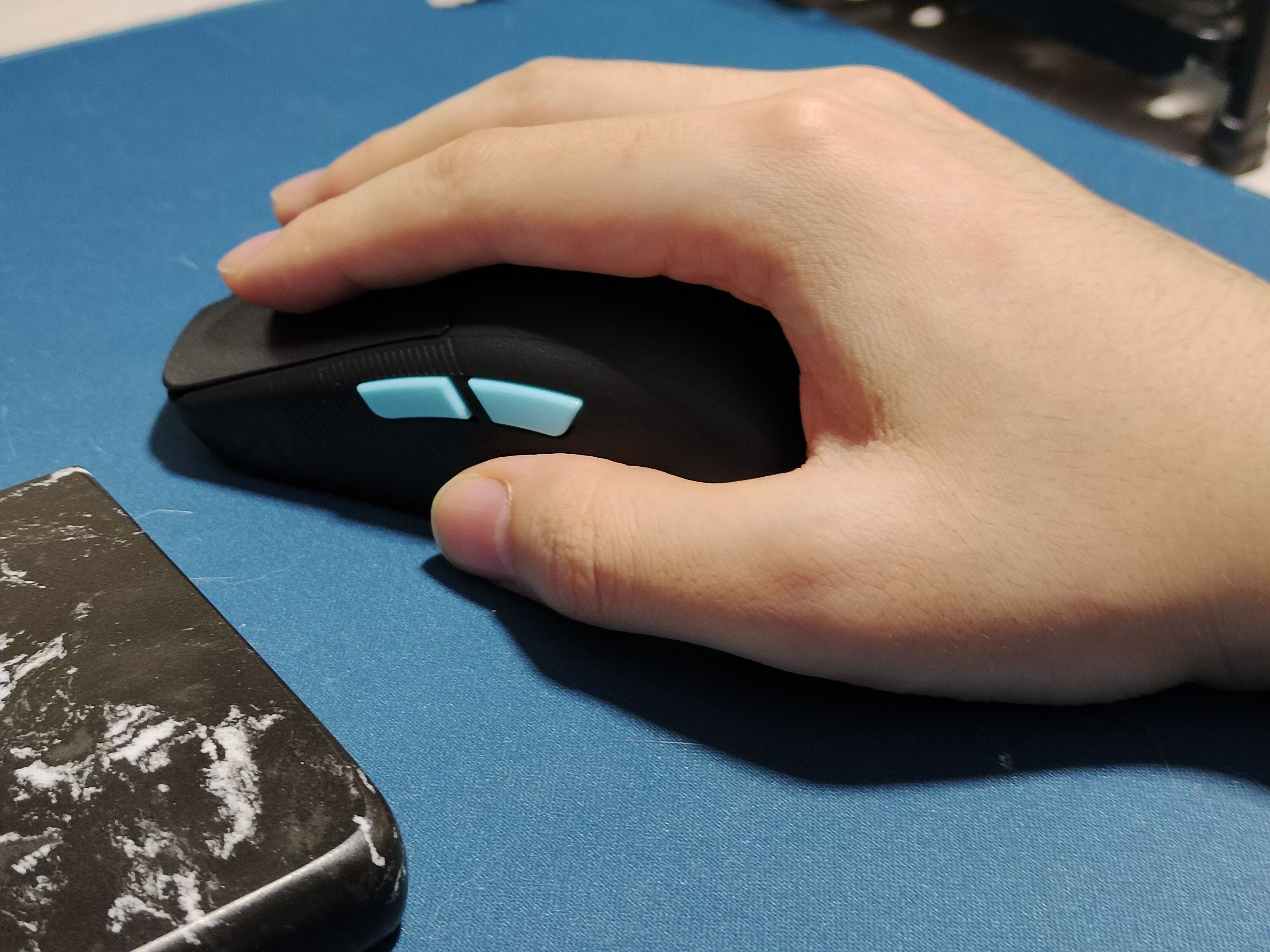 其次是模具,龍鱗這款鼠標是對稱設計,在左手邊有一對側鍵,鼠標的中部圓潤挺拔,趴握狀態下手心自然貼緊,手感十分舒適。在我上手這把鼠標時幾乎完全沒有磨合時間,上手即用,在我自己之前玩的鼠標裏上一個這種感覺的鼠標還是某gpw。指握和抓握我個人使用較少,但這款鼠標給我印象很好。