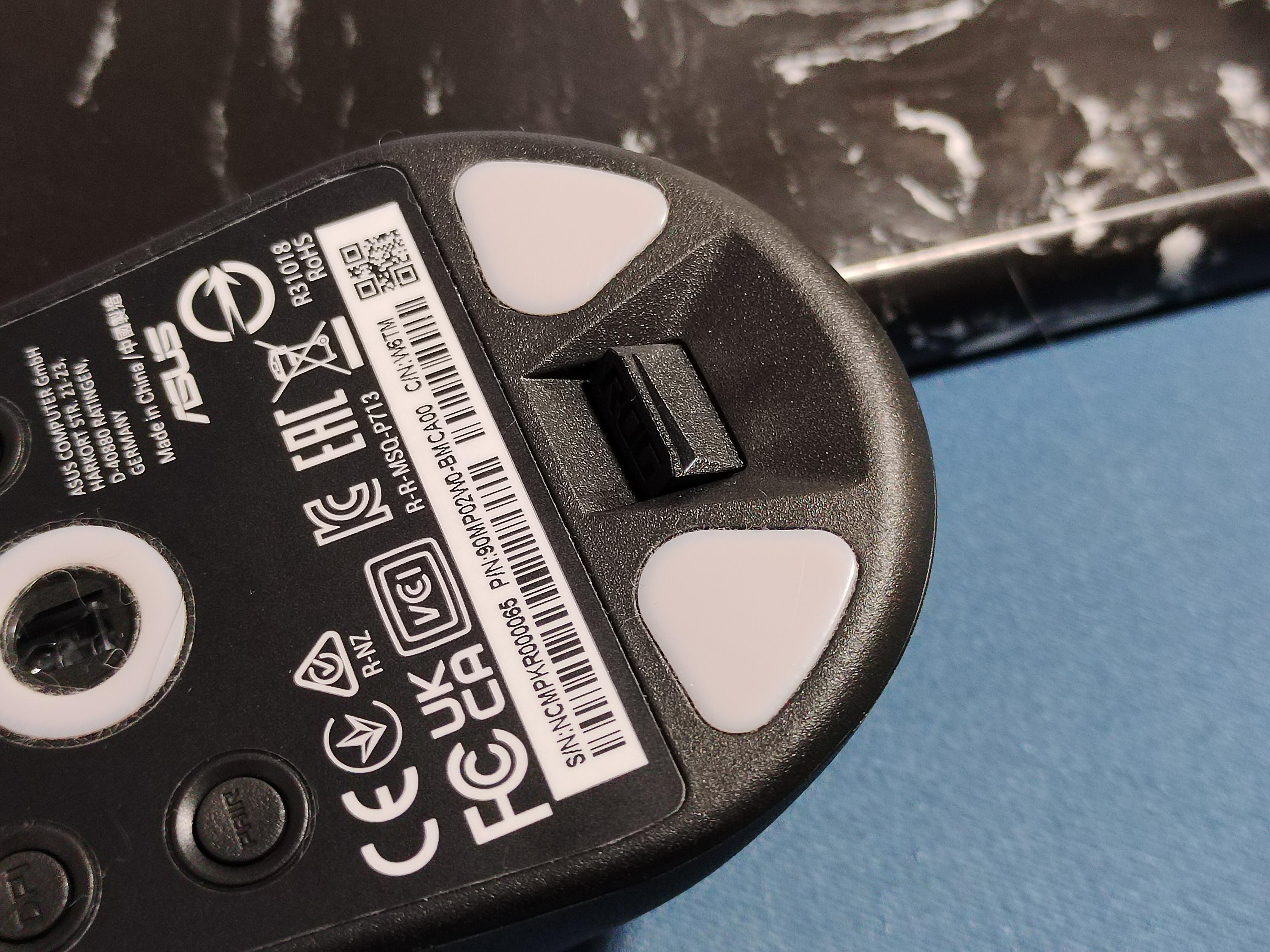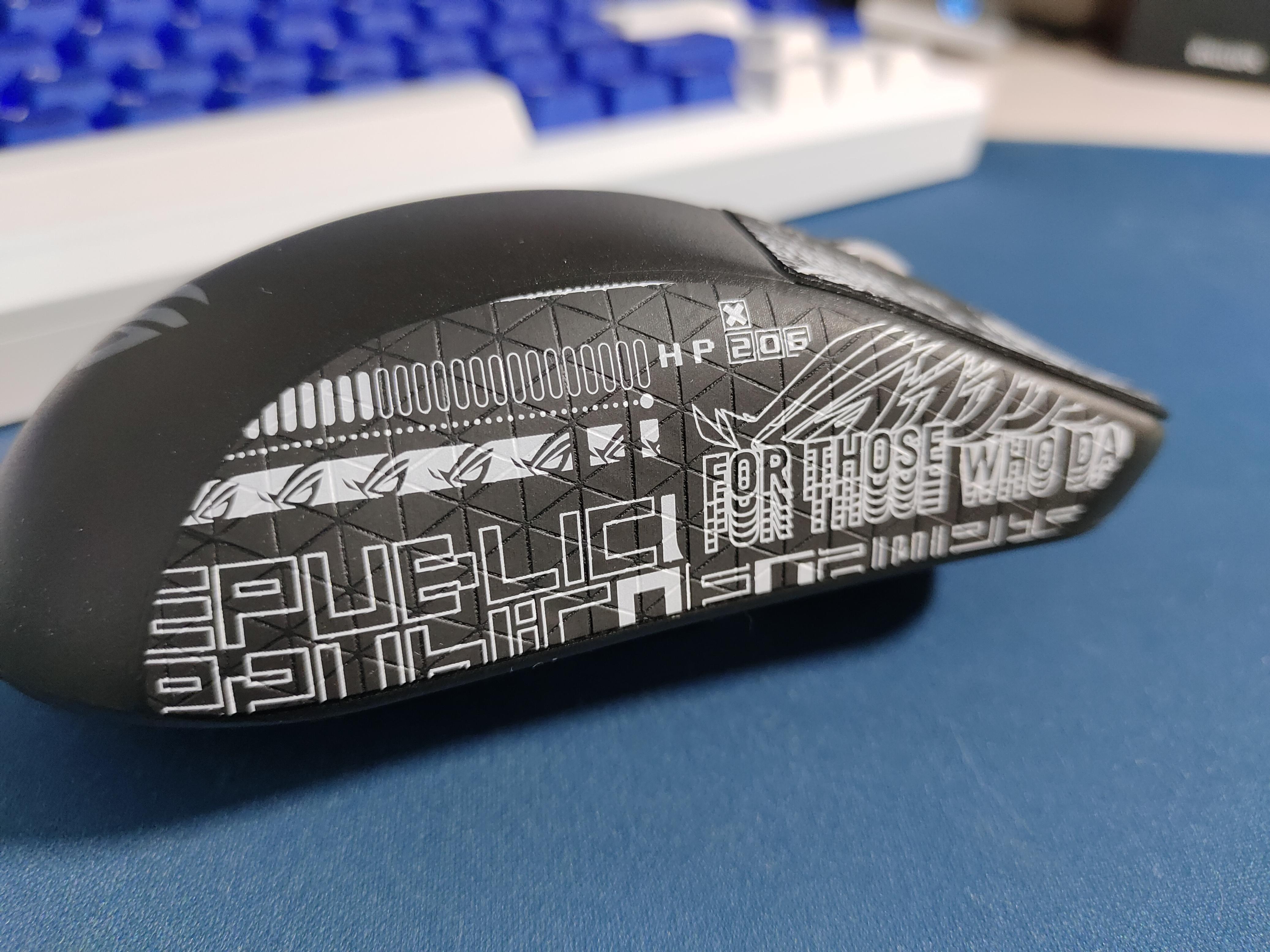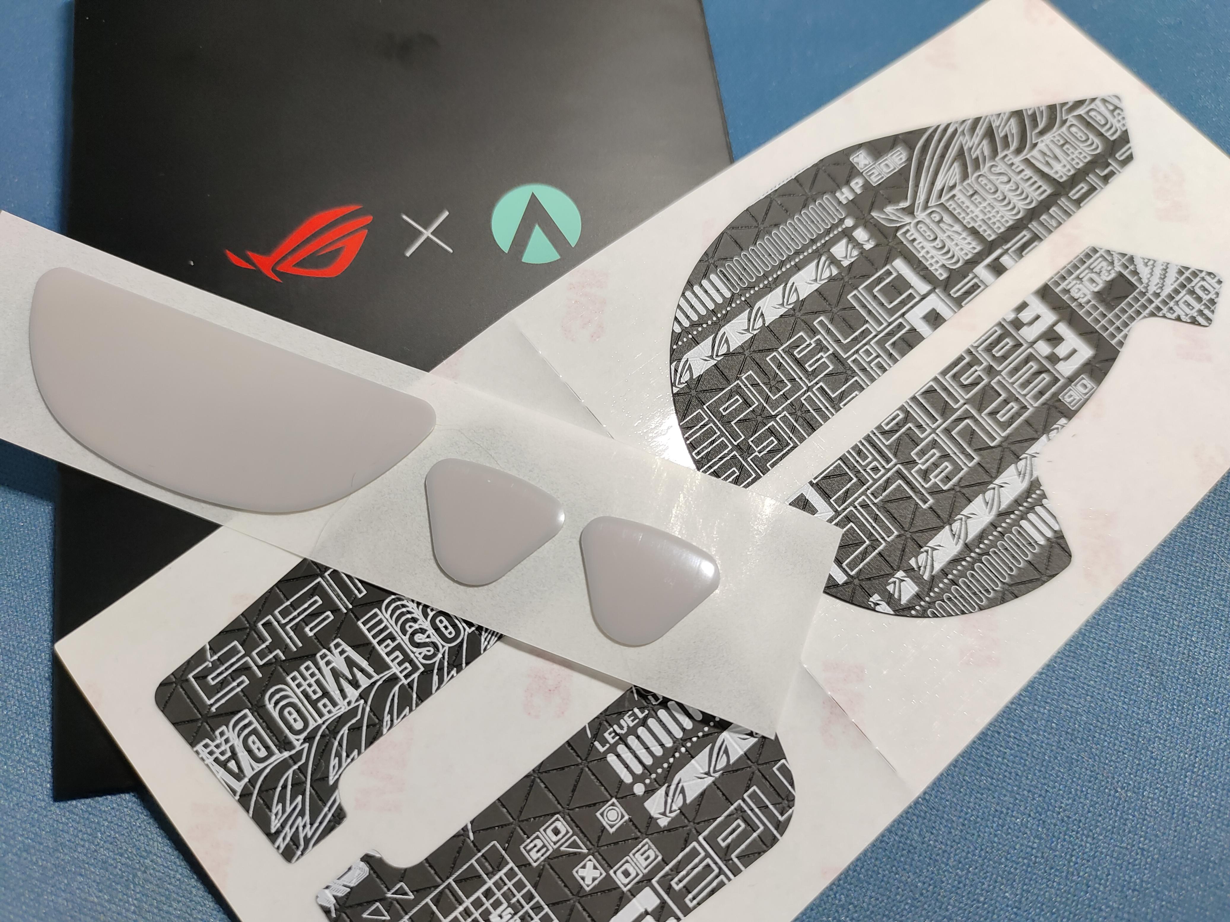 外觀數據上,鼠標重量爲54G,屬於目前最輕那一批鼠標,並且鼠標上無任何打孔,ROG定製微動,手感屬於清脆的那一類,不過沒有微動熱插拔,估計是爲了減重。外殼呈磨砂觸感,不會因長時間使用而發黏。贈送了定製防滑貼紙,傘繩數據線,usb延長器(有點帥),贈送了腳貼並且與原裝的材質一樣,爲100%PTFE特氟龍。