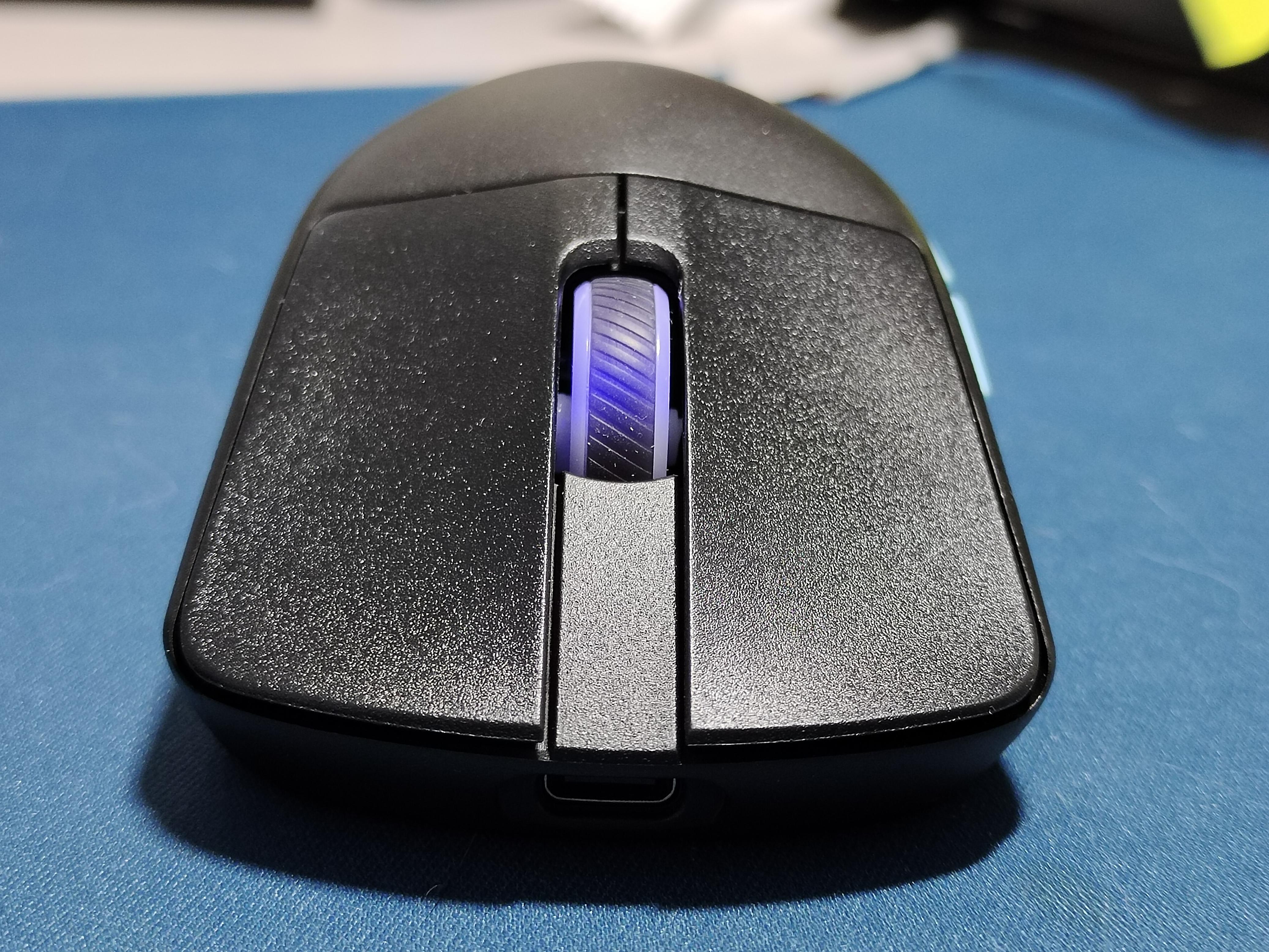 鼠標正面可以看到一個帶有燈光的編碼器,內收的腰線,渾圓的臀部以及有着淡灰色眼睛logo的尾部。