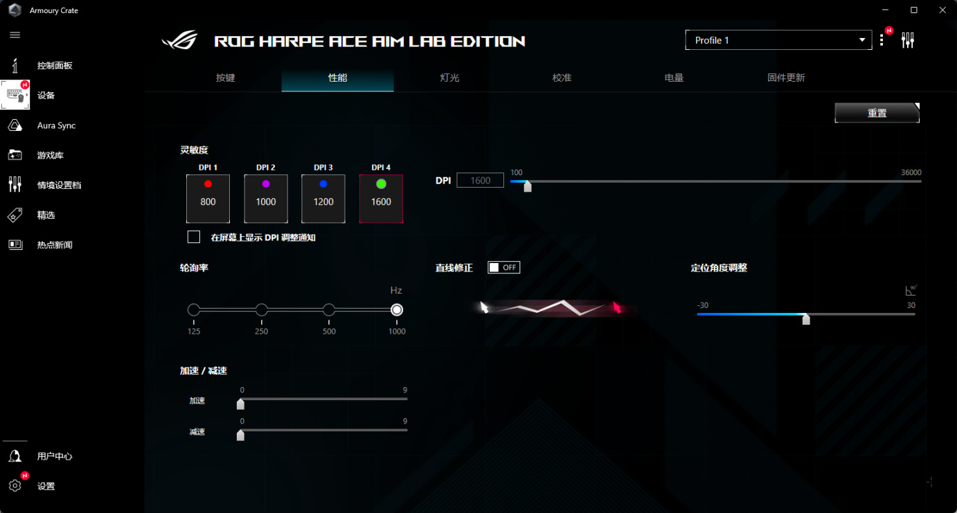 在設備設置中可以自己設置鼠標的靈敏度(dpi),鼠標回報率,是否直線修正,定位角調節。