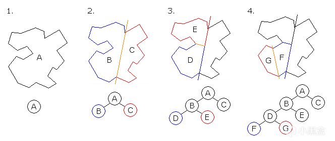 与此同时,老黄才刚刚被卡马克的一系列创新所震撼,还没有成立英伟达公司,没有显卡的PC可以说是寸步难行,而卡马克为了解决PC的渲染问题,继续从算法的角度切入,发明了一种新方法——二叉空间分割算法(BSP树)。