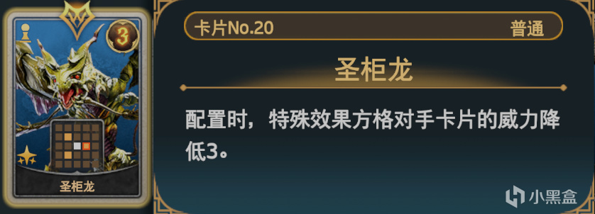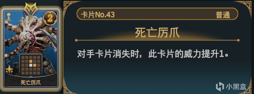 死亡厉爪:先将死亡厉爪放置在棋盘上后,之后配合圣柜龙将对方的卡牌打飞,那么死亡厉爪的卡牌威力就会增加1点。