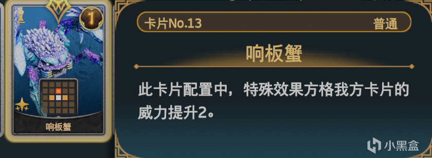响板蟹:刚刚提到的仙人掌怪是空心红色BUFF,现在这个响板蟹红色BUFF格子是实心的,所以可以占领格子和提升灯泡等级。通常放在第二行和第三行来提升自身上方的卡牌威力。