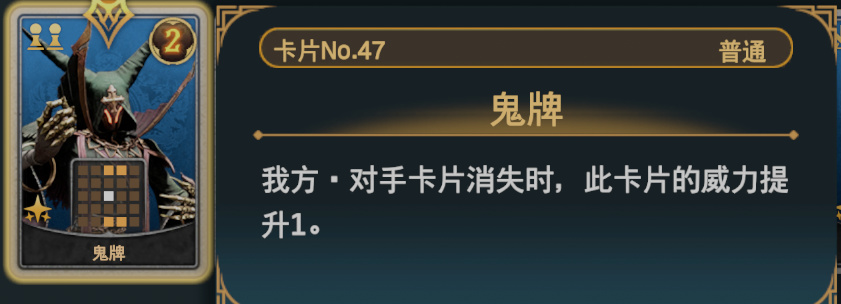 鬼牌:烧牌流的另一个核心卡牌,我方消失威力加1,对方的卡牌消失也会加1,由于中后期对面也会有覆盖自己的卡牌的行为,所以这张卡可谓攻守兼备,也需要尽快放上场,由于卡牌的占位通常放在第一行或者第三行。