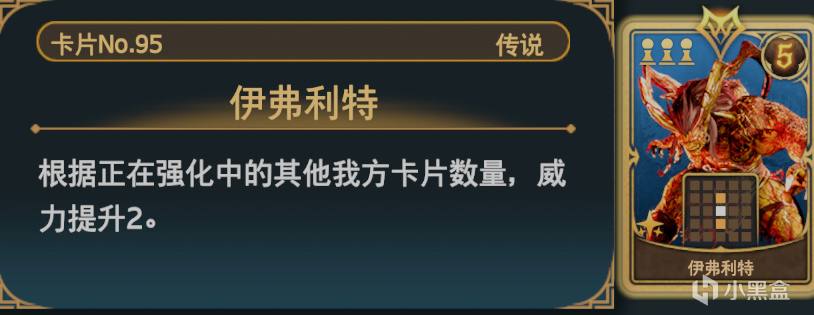 伊弗利特:可以看到即使没有红色区域的卡牌也会有特殊的技能,伊弗利特可以根据其他正在强化中的卡牌,来增加自身的卡牌威力,也就是说之前响板蟹和仙人掌怪的红色BUFF区域上有牌,那么伊弗利特自身就会根据正在强化的卡牌增加2点威力。有两张正在被强化的卡牌那么伊弗利特就会增加4点威力。