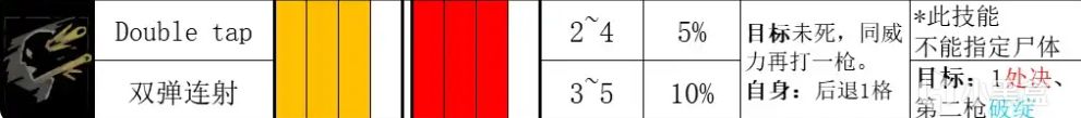 雙彈缺點是不能打四號位(神槍同時加強的手槍射擊能彌補這一點),喫拐率低。另外後退1的特性使得神槍最終會跑到四號位,因此不太適合和鍊金、邪術組一隊,配合外科、野心倒是挺不錯。