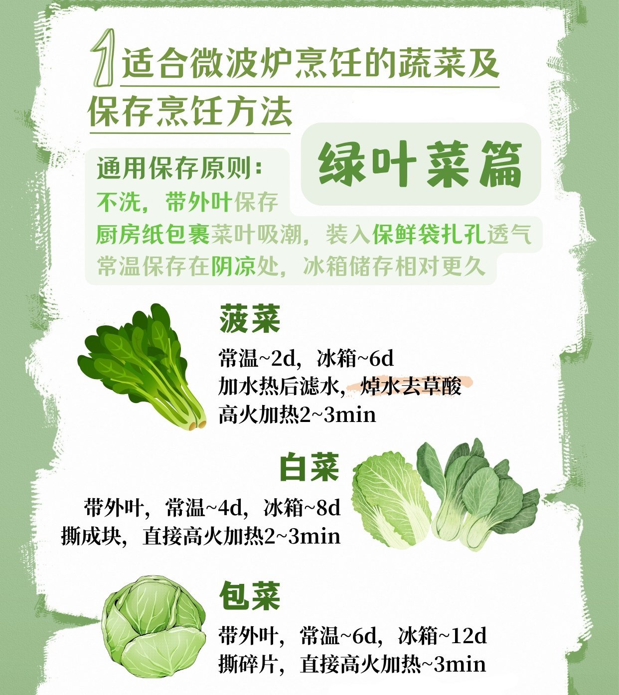 ①適合微波爐烹飪的蔬菜,對應保存時間、製作參數
