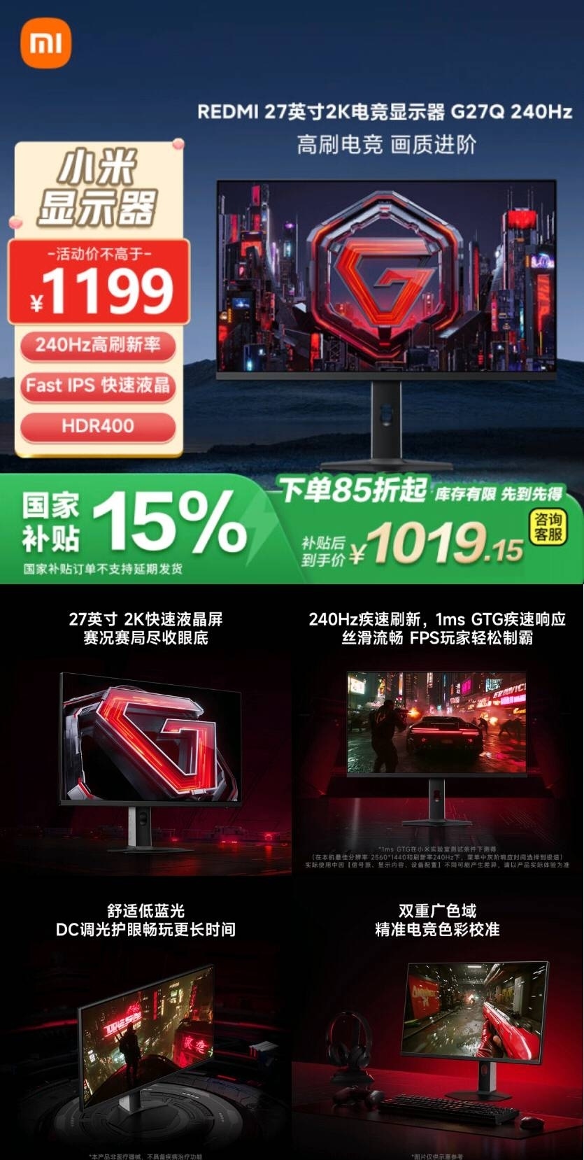 小米出品,1019元,210Hz的高刷,支架功能齐全,400尼特也没阉割,跟HKCag24H4比起来丰富了支架功能,其他参数差不多,主要看自己喜欢什么外观。