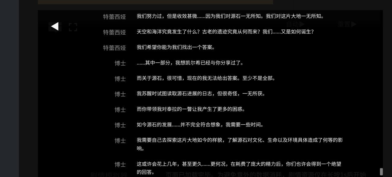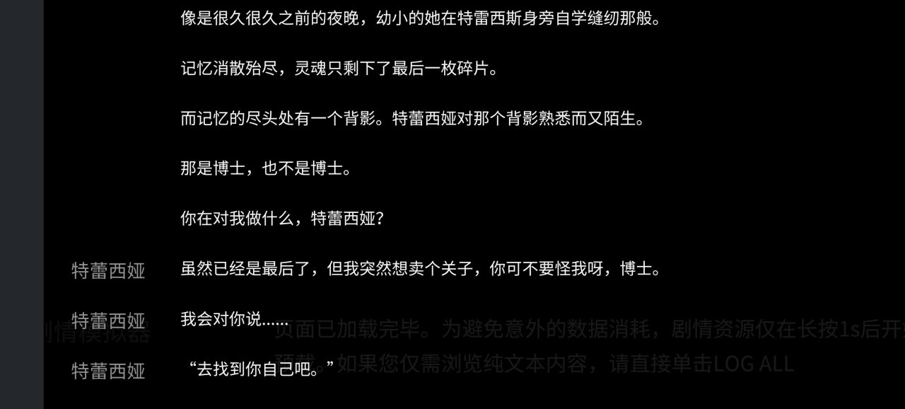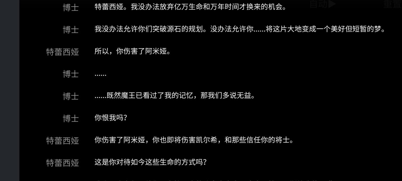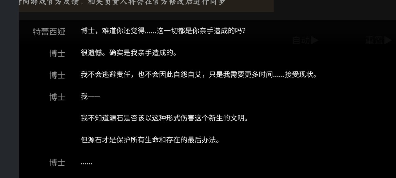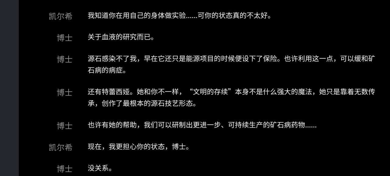 然後博士就開始用他超凡脫俗的智力開始狠狠惡補泰拉知識,特雷西婭開始跟他問問題。博士心想我躺了都不知道多久就等着項目結束,現在把我叫醒告訴我工程才做了沒一半還滿地都是bug我自己也很疑惑啊,能不能等我緩緩再說。