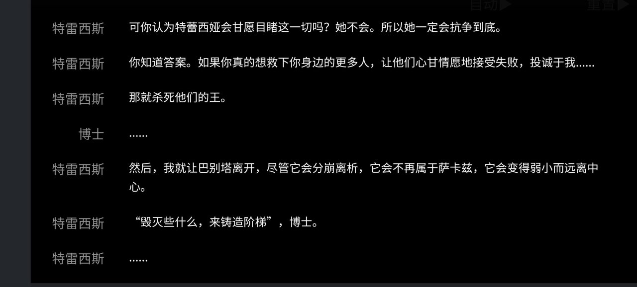 與此同時賽博女仙的留在博士體內的小玩具開始發力,給搖擺不定的博士推了一把,於是博士跟特雷西斯談條件爭取救下更多人,但是對薩卡茲來說戰爭與和平他們只能選一個,一旦心存希望對戰爭便不再全力以赴,所以就是皇女和皇女的追隨者只能選一個,在這種情況下,博士和特雷西斯的交易達成了,博士給出前文明的武器鑰匙,特雷西斯只准紗皇女,瓦解巴別塔後要快速發動席捲泰拉的戰爭加快源石傳染的速度。