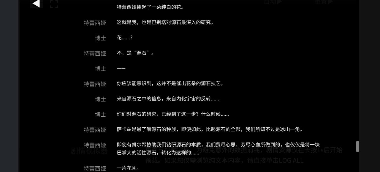 而那個粉色頭髮的泰拉女孩,特地向你顯示了她費盡心機對源石的運用。她已經探究到源石的本質,可以從源石內部的信息逆向轉錄出一片花圃,她告訴你她對未來和生命的期盼,像幻夢一樣美麗。