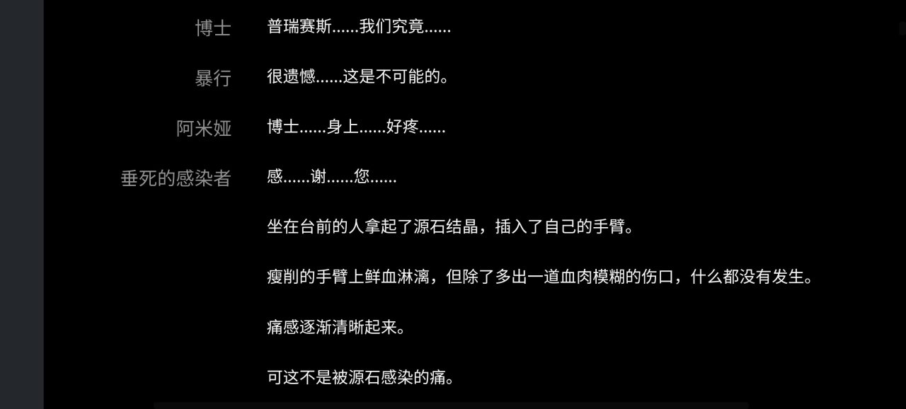 後來的博士不惜用源石結晶來切自己的身體來反覆做實驗,這也是後來阿米婭礦石感染飆升那次凱爾希抽了博士的血提煉血清來消退阿米婭的礦石感染程度彩蛋