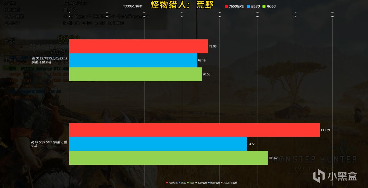 高预设下 各卡开各家的技术 不开帧生成,三张卡的成绩都差不多,A卡略微领先,开启帧生成后,B580开和7650GRE一样的FSR 3.1质量,7650GRE的帧数遥遥领先