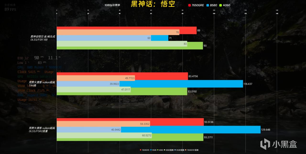 到了相当吃显卡的黑猴,高预设 开启帧生成,B580开FSR,4060的帧数表现和画面表现都是最佳,果然N卡是黑猴的唯一选择,不对应该说是40系及以上显卡是黑猴的唯一选择