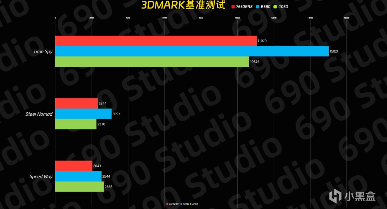 所以在3DMARK理论性能测试上,综合下来性价比最高的是B580,7650GRE略值于4060,那跑分归跑分,B580是实际游戏还能领先呢 还是说这就是张“3DMARK诈骗卡”