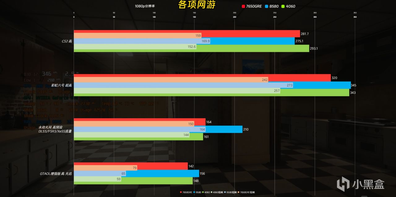 网游方面,首先是CS2基准测试,N卡表现最佳,B580最差,彩虹六号下B580微弱领先,7650GRE表现最差