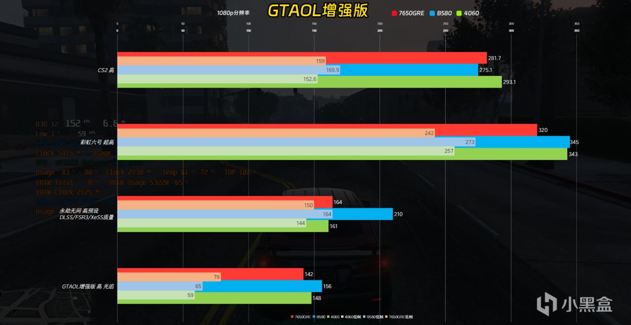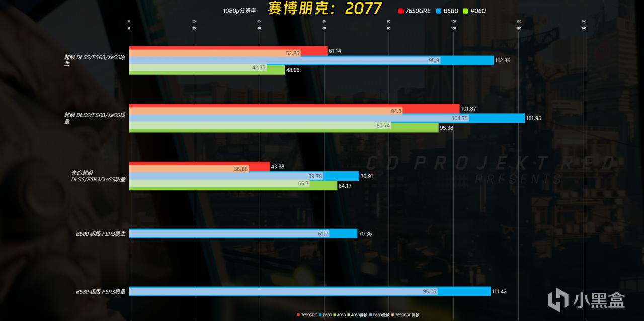 第一款游戏还是著名显卡测试软件 赛博朋克2077,考虑到实际游戏的时候,4060肯定是要开启DLSS,7650GRE开启FSR3,B580呢可以开Xess和FSR3,所以 测试成绩如下