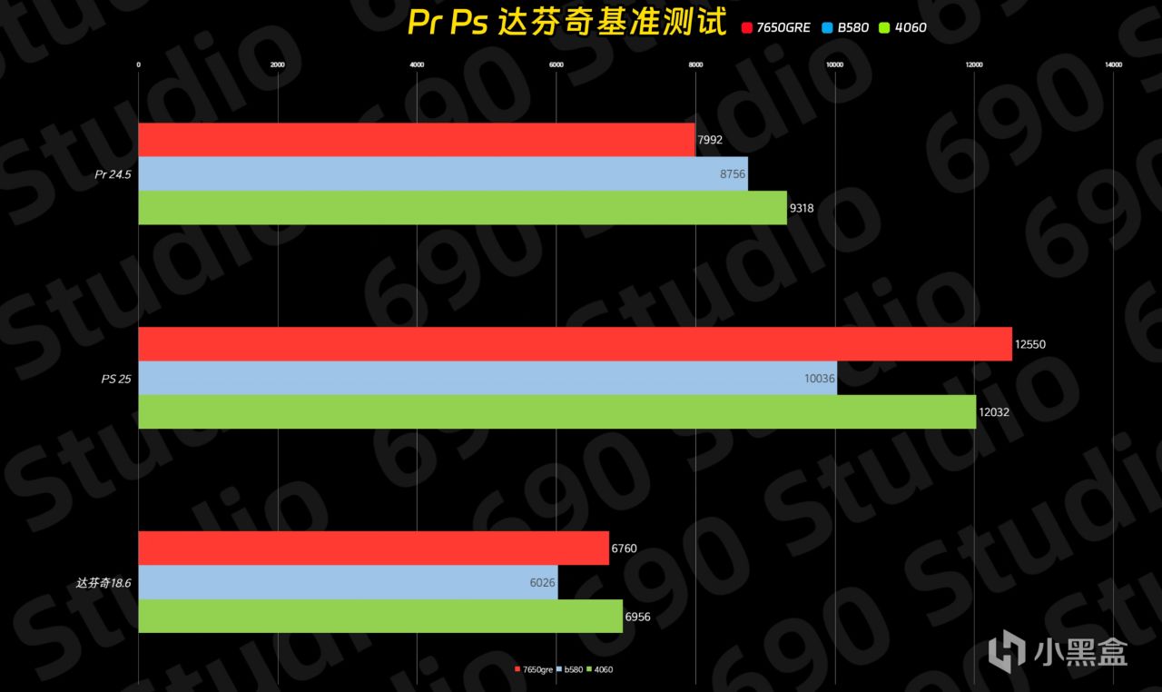 那既然提到了生产力,这里咱们也是测试了Pr Ps 达芬奇的基准测试,从结果上来看呢,N卡在剪片子这件事情上优势还是很大的。