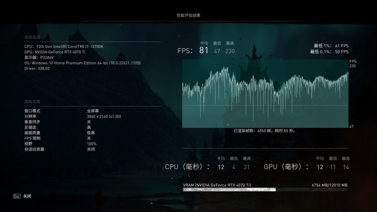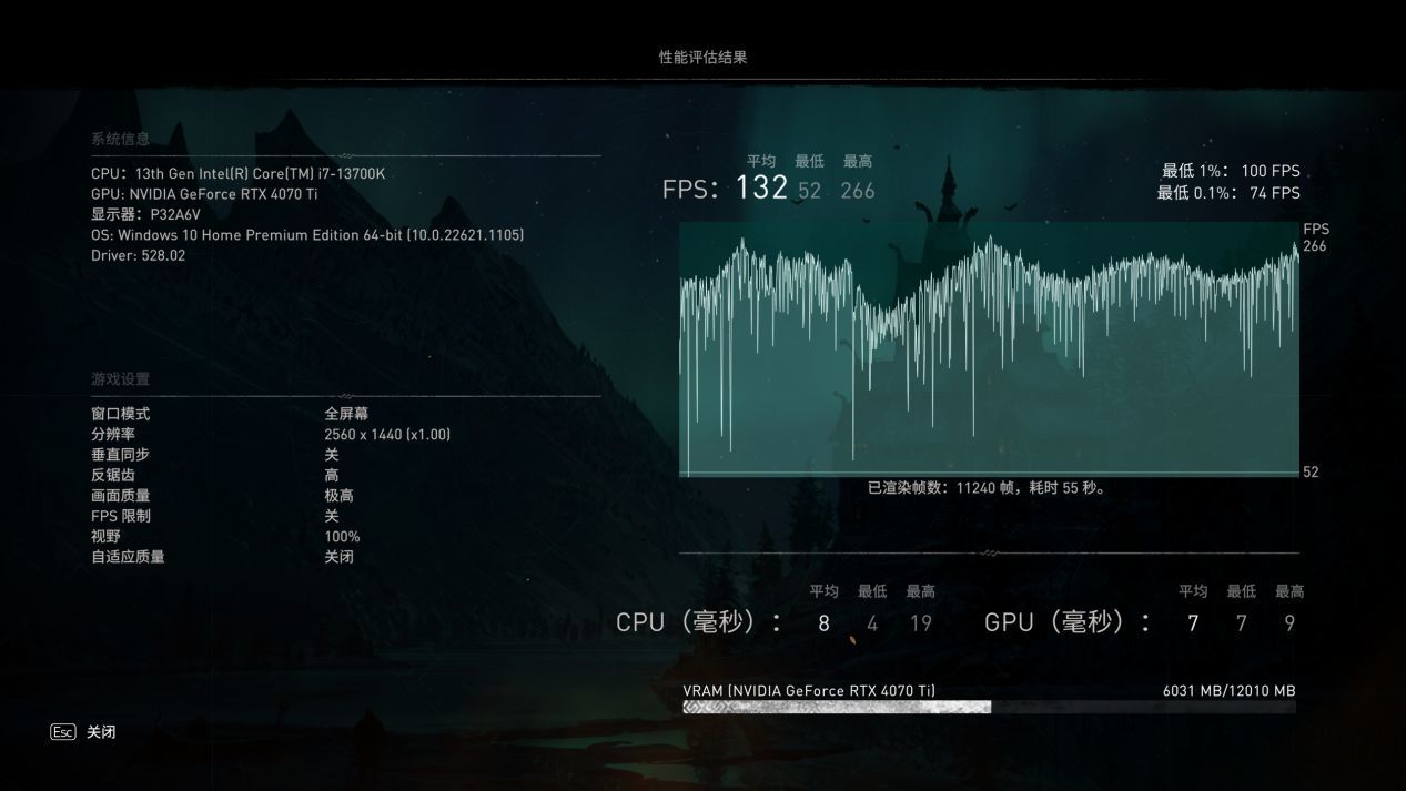 4K分辨率三極致平均幀數242,房區內基本都在250幀左右,野外會掉到200幀以內,平均幀數還是挺高的,分辨率調成2K的話,平均幀數能到350幀左右。