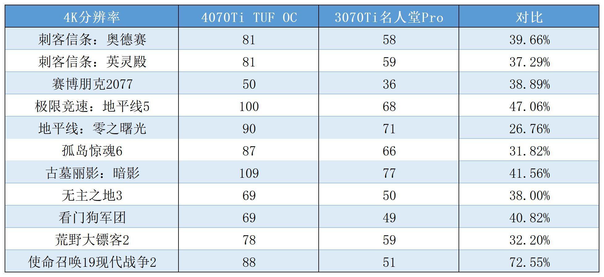 4K分辨率10款3A遊戲的幀數4070Ti平均比3070Ti高37.4%