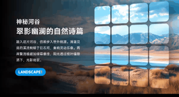 图片与文字像是技艺高超的魔术师助手,有序交替登台。背景恰似一块神奇画布,随着画面切换,迅速染上不同风景的色彩。每一次转换,都精准拿捏节奏,既像时光的指针精准跳转,又似灵动的画笔挥洒诗意。它不仅让景观展示独具一格,更让信息如清泉般潺潺流入观众心间,让整个演示在艺术与实用间找到完美平衡,令人眼前一亮、回味无穷。