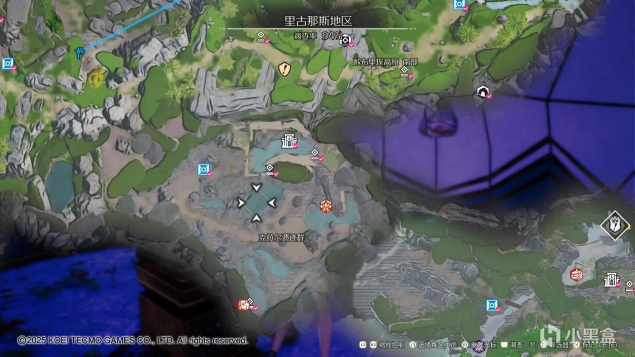 由于主角的高机动性,本作给地图设计了很多纵向的可到达空间,但地图却不能直观地反映高低差关系,这就导致有时候看着点标在地图上,实际过去的时候却被一道高墙或者一座山挡住不知道怎么过去的窘境。比如下面这个克拉尔遗迹群,有多少朋友是在1图找了半天路都过不去才知道是要开了2图才能去的?