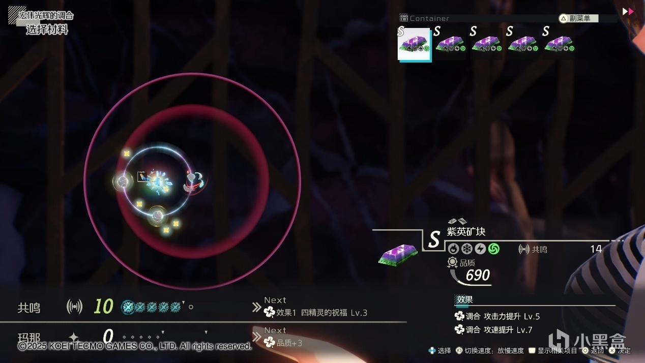 调和的操作其实就是套圈。在每个材料槽里放进物品可以生成一个圈,圈套到其他材料槽了就增加共鸣一栏的点数,套到玛那(黄色的光点)了就会增加玛那一栏的点数,给这一级的点数套满了就会升级。因此在调和中我们需要做的其实就是生成的圈更大来套到更多东西。