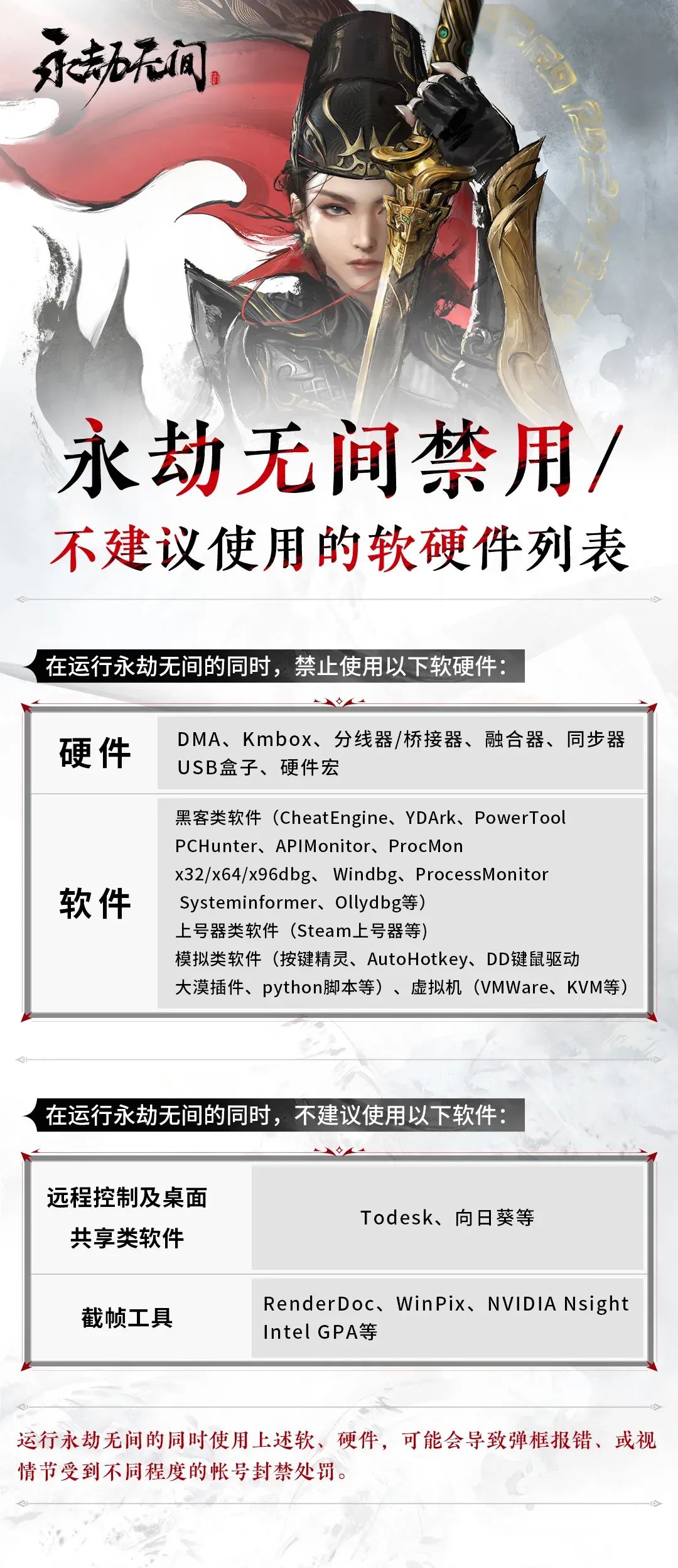 永劫無間完成全部服務器線上更新,對該類型外掛實現全面滅殺,在遊戲內識別到該類型外掛特徵後即刻踢出當局戰鬥,並對該賬號進行封禁處理