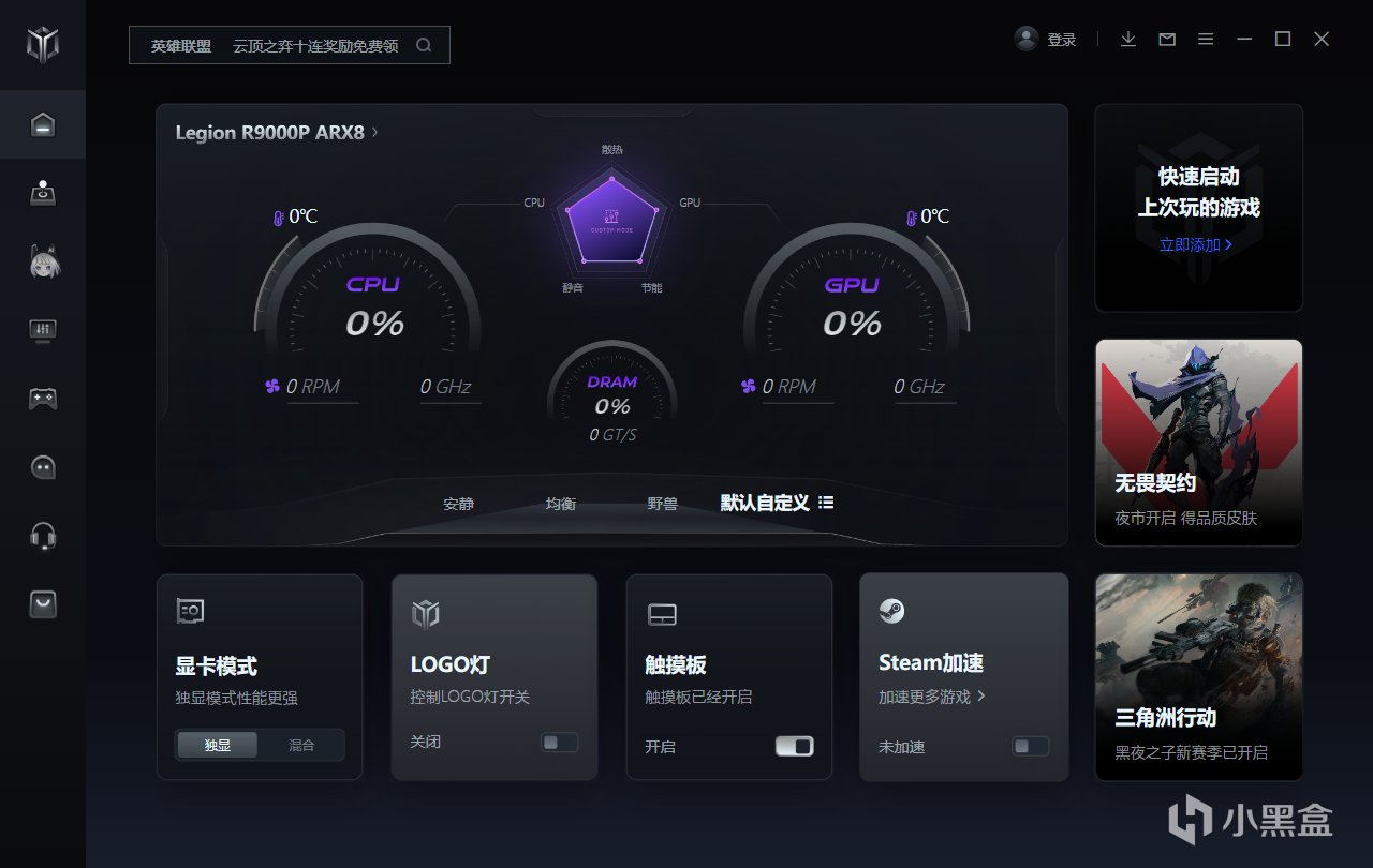 第一页是显示了绝大部分参数包括CPU和GPU频率、占用率,内存占用率和速率,当前预设模式,还有本地游戏快捷启动,下方是独显模式切换、背部背带裤logo灯、触摸板,还提供了加速器选项。