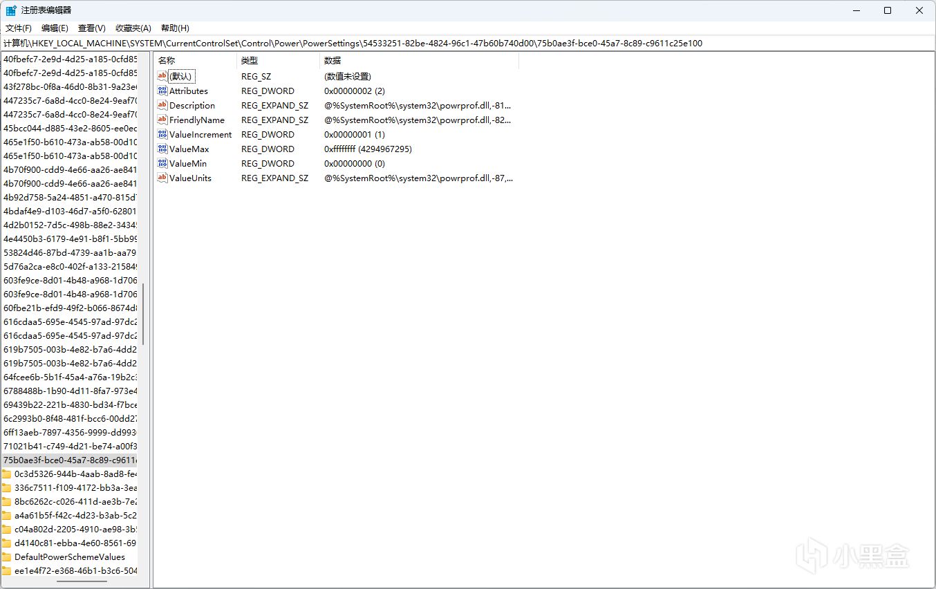 计算机\HKEY_LOCAL_MACHINE\SYSTEM\CurrentControlSet\Control\Power\PowerSettings\54533251-82be-4824-96c1-47b60b740d00\75b0ae3f-bce0-45a7-8c89-c9611c25e100