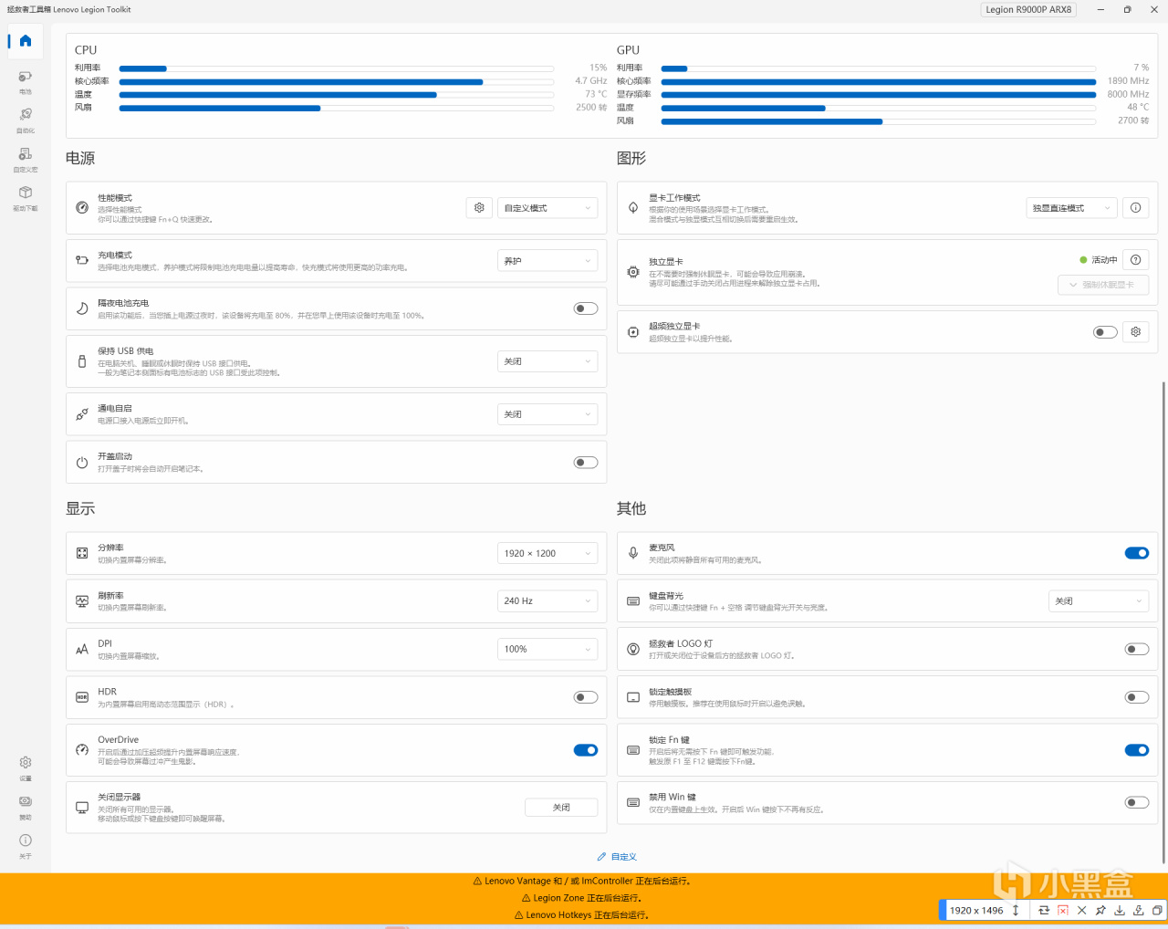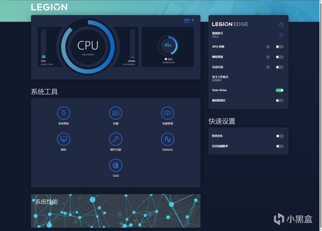 首页简单明了,包括了性能模式,GPU超频,网络增强(建议别开),自动关闭,独显直连,屏幕OD,快速充电,wifi安全(建议不开)