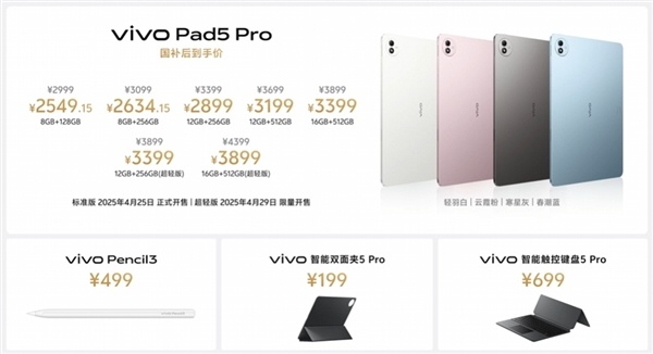 價格方面,vivo Pad5 Pro首發就支持國補,8GB+128GB 2549.15元、8GB+256GB 2634.15元、12GB+256GB 2899元、12GB+512GB 3199元、16GB+512GB 3399元。