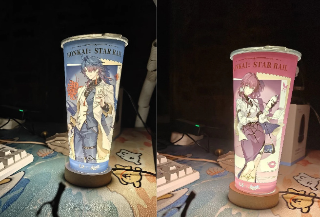 首先,遊戲與餐飲品牌聯動的核心吸引力在於周邊,而本次聯動中的周邊相當精美,兩款聯名飲品 "刃:蘋果金鳳梨" 和 "卡芙卡:超 A 芝士葡萄"杯身均經過特別設計,印有兩位新角色新裝扮的全身立繪,整體色調也與代表角色保持一致,尤其是杯體採用了半透明材質,在燈光下瞬間從奶茶杯化身小夜燈。