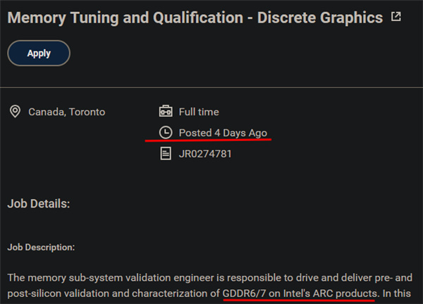 另外,根據最新發現的職位招聘啓事,Intel正在爲Arc桌面顯卡探索採用GDDR7顯存。